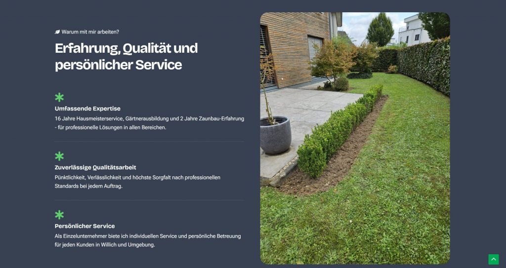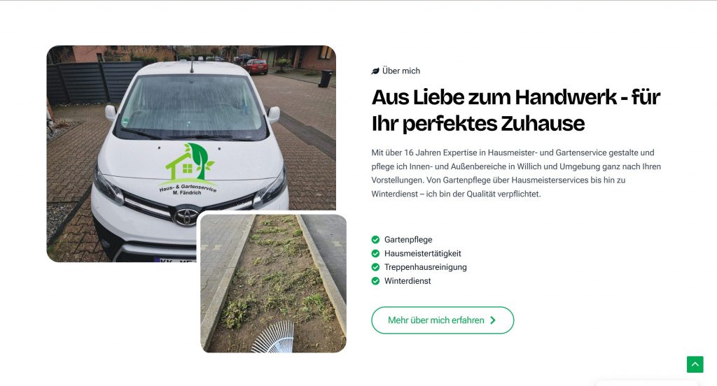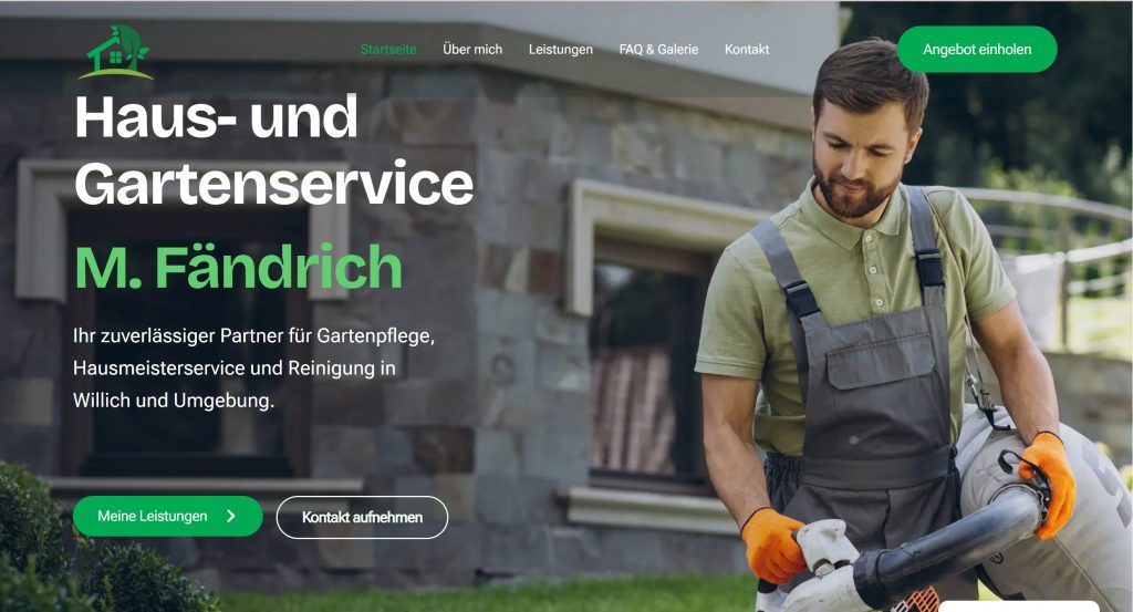 Für einen regionalen Haus- und Gartenservice aus Nordrhein-Westfalen habe ich eine komplett neue Website gestaltet. Modern, strukturiert und optimal auf die Zielgruppe abgestimmt. Der Fokus lag auf den Dienstleistungen und einer klaren Conversion-Ausrichtung über Kontaktformular oder Telefon.
